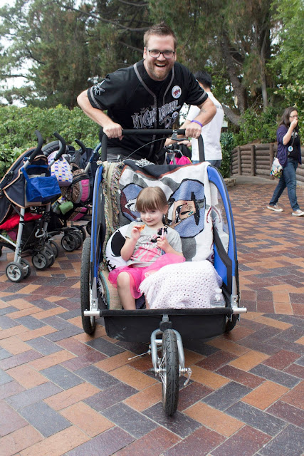 Now it sounds nuts to try that as adults and much, much crazier to make a three year old spend 24 hours inside a Disney park. We knew we had to plan ahead if we were going to make it all 24 hours. First we knew that the little one would need a place to sleep. She couldn't stay awake for an entire 24 hours! We weren't even sure we could! So we got out our trusty bike trailer thing, which, by the way, is a fabulous invention. It not only can be hooked up to a bike, but can also be used as a handy dandy jogging stroller. It is made to fit two kids and is rather wide, but does not have separate seats, so it was perfect for one small child to be able to stretch out and catch some Z's. Plus it could be fully enclosed and therefore slightly quieter inside. We made sure it was extra comfy with two pillows and two blankets. We began calling this her "Chariot".